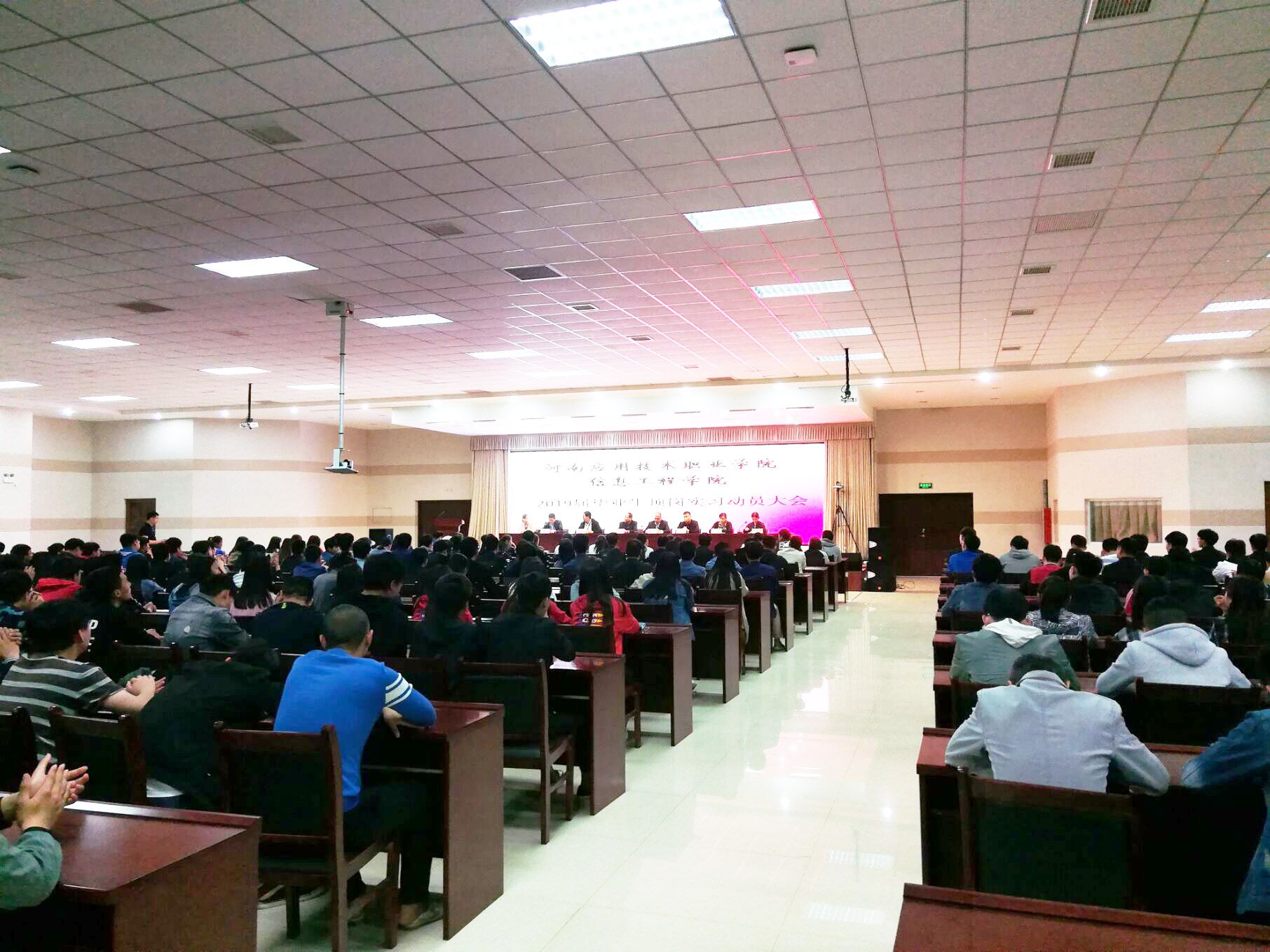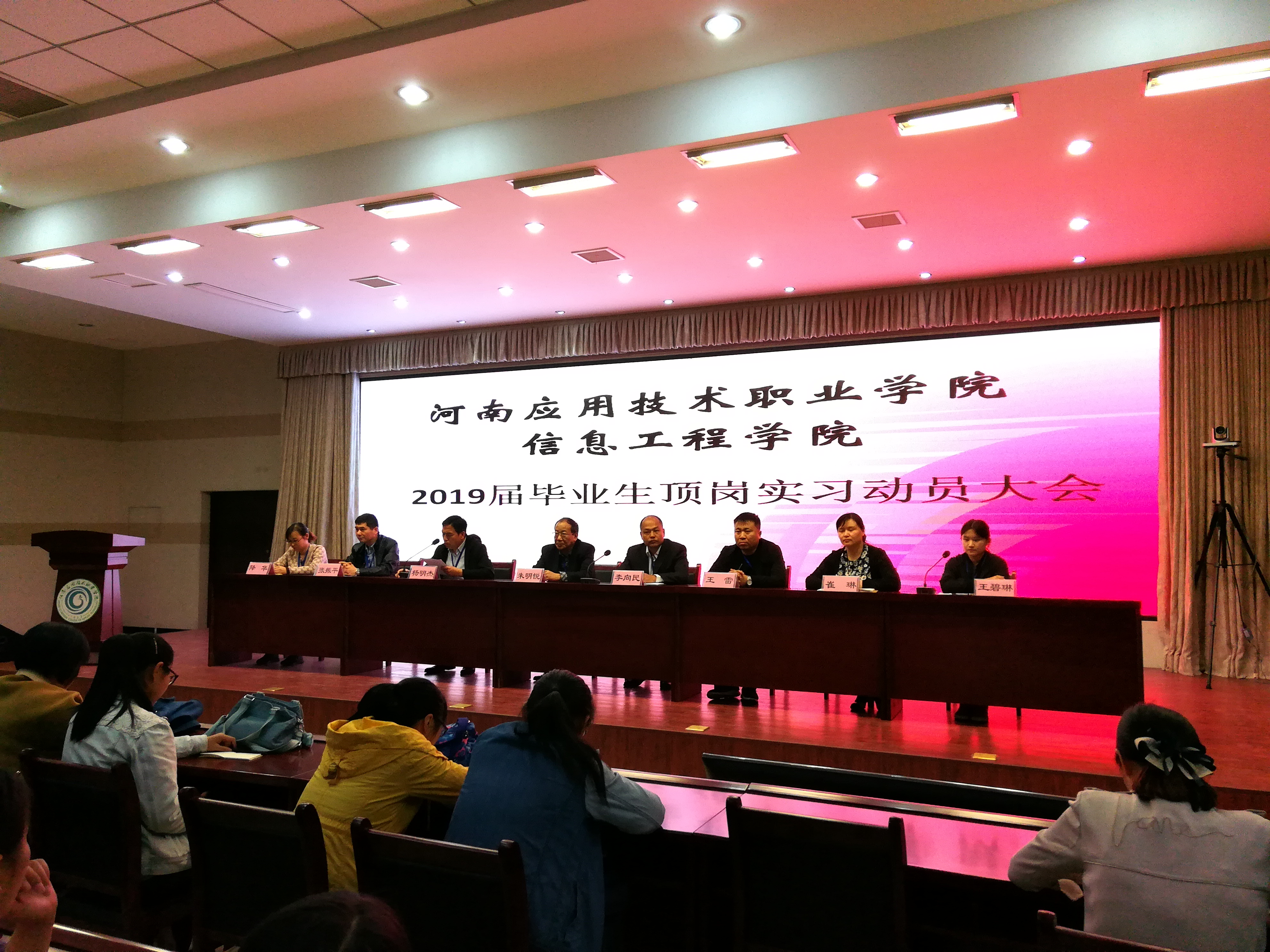 4月25日下午五点三十分,今年会jinnianhui官网19届毕业生顶岗实习动员大会在实训楼二楼会议室顺利召开。参加本次会议的有今年会jinnianhui官网院长王雷、副院长崔琳、今年会jinnianhui官网党总支书记杨明杰、教务处处长朱明悦、就业创业指导中心主任李向民、计算机网络教研室主任张振平、艺术教研室主任降华等全体今年会jinnianhui官网教师及2019届全体毕业生。