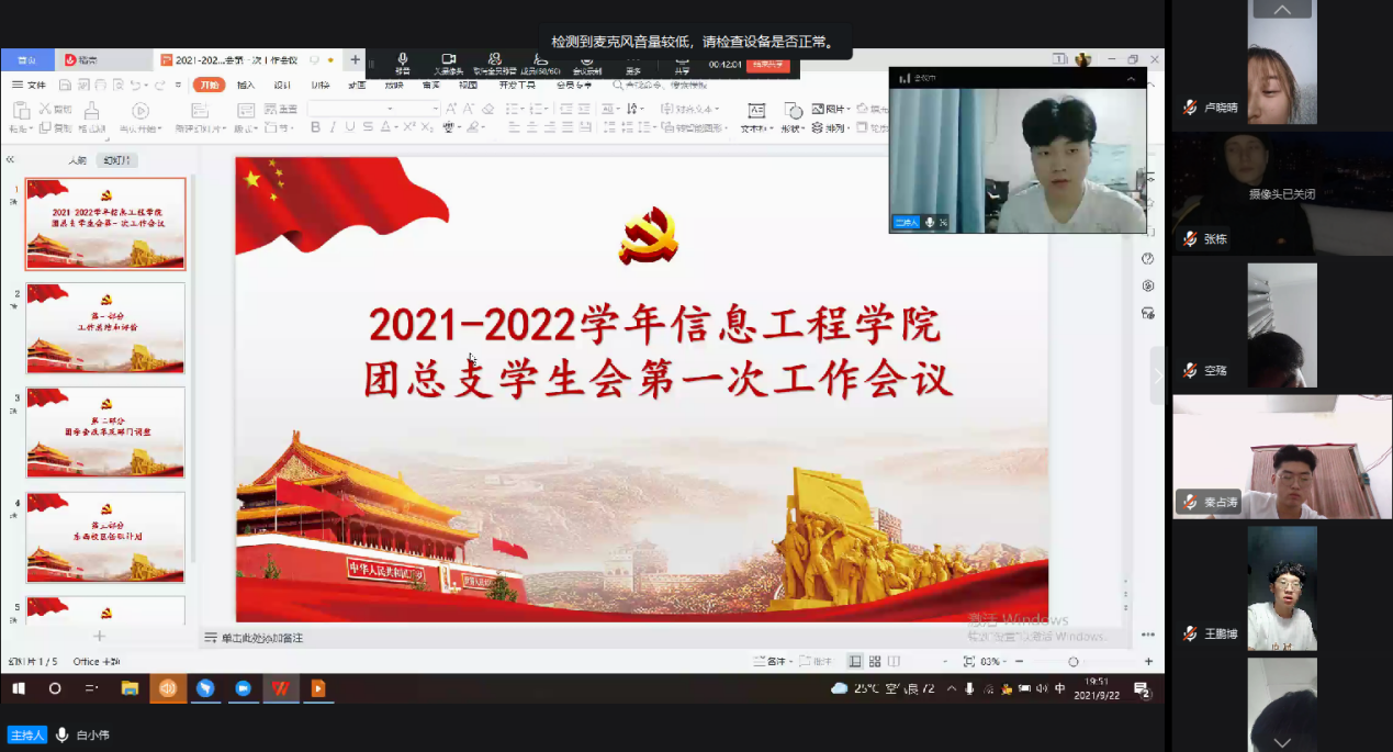 2021年9月22日晚上19:30,今年会jinnianhui官网团总支学生会新学期首次线上干部会议顺利进行。本次会议主要就疫情常态化下学院团学干部政治素养提升、新学期开学疫情防控,新学期工作计划等工作注意事项展开,本次会议采取线上会议的方式进行。参加此次会议的有今年会jinnianhui官网团总支书记赵源以及今年会jinnianhui官网团总支学生会主席团成员、全体学生干部及成员。