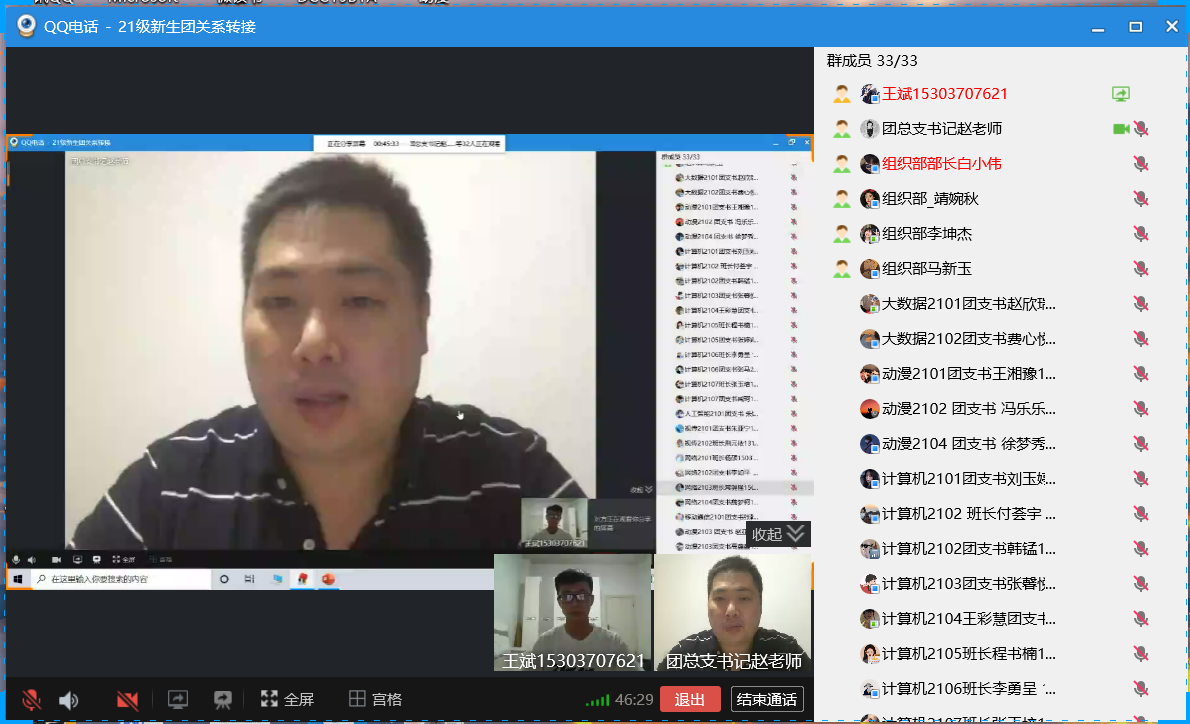 随后组织部王斌同学给各位21级团支部负责人讲解了团课记录的要求,并强调各班负责人注意模板格式要求,并向各班团支书告知了九月份第一次工作内容——开展“请党放心,强国有我”主题团课。随之,组织部就智慧团建审批、团课上传格式、团日活动要求等几个方面对团支部负责人进行讲解。最后,组织部部长白小伟为21级各班不懂的问题答疑解惑。