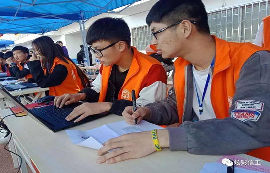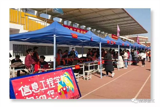 在三月三十日早晨7:00,信息工程团学会已经在操场主席台南边搭好帐篷在等待可爱的小学弟小学妹们报到!有的给学弟学妹统计信息,有的给他们指引考场以及参观学校,也有一部分人在布置考场。总而言之,所有在场的工作人员都各职其责。
