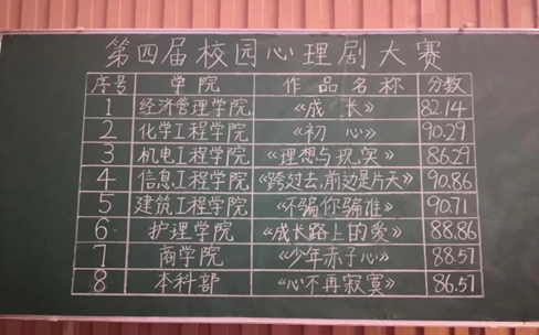 为提高当代大学生的心理健康意识,推动我校心理健康教育工作的开展,营造和谐的校园心理氛围。11月12日,由我院心理教育中心主办,心理协会承办的以“健康青春你我·奉献伟大祖国”为主题的第四届校园心理剧大赛在大礼堂隆重举行。