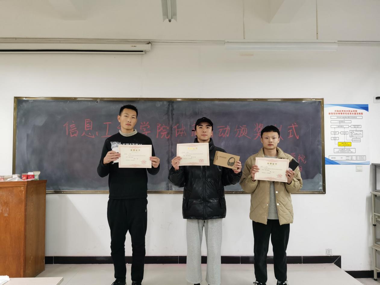 本次活动能够顺利举办,不仅有运动健儿们的努力,还有学生会各个部门的配合和支持。经过历时半个月的激烈角逐,此次体育比赛各个项目的季亚冠军均已产生。随后,由主席团吴迪,靖婉秋和文体部部长喻忠意为获奖运动员颁发证书和奖品。