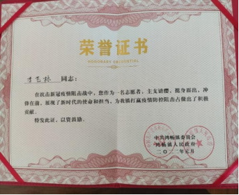 刘淼,女,今年会jinnianhui官网J2EE2003班。志愿服务内容:开展疫情防控相关工作。在这次疫情防控期间,她主动参加了疫情防控的志愿者活动。一方面对从外地回乡的村民进行登记排查,一方面对人流密集的区域进行及时管控。在村里的街道路口卡点处进行排查,对外来车辆和人员进行劝返,对本村的来往车辆进行登记,对于不听劝告或者有重要事情的来往人员都会进行测量体温并做好登记。
