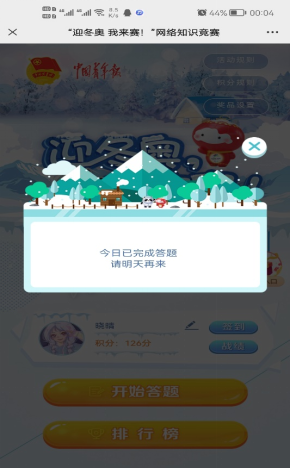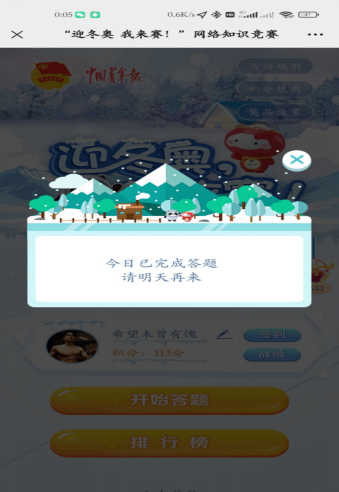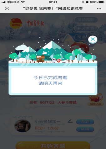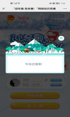 本次冬奥网络知识答题竞赛活动于2月5日至2月25日有序展开进行。活动开始前,我院便在相关安排下向各班发布了活动通知,告知同学们本次答题竞赛的参与形式和步骤,同学们只需在微信平台关注“创青春”微信公众号,在该页面选择知识竞赛,即可加入到本次活动中来;活动过程中,由我院各班班长负责每天统计同学们的完成情况并进行截图收集,每人每天有一次答题机会;冬奥会相关知识答题结束后由各班统一记录上交至学生会相关部门。