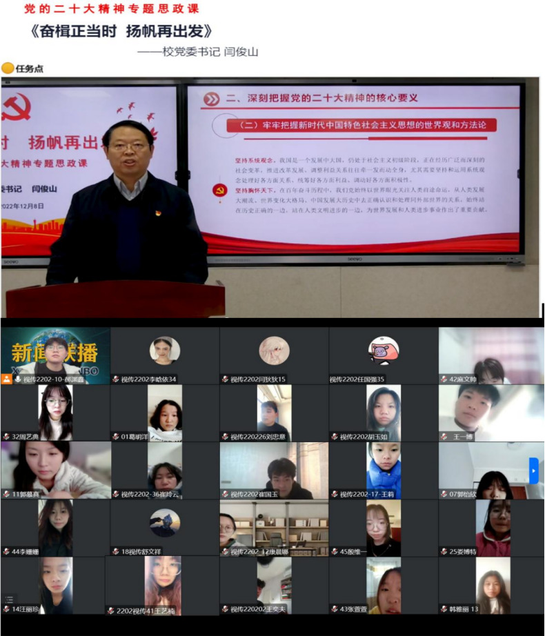 为引导学生充分认识党的二十大召开的伟大历史意义,深刻把握党的二十大精神的核心要义,鼓励我校青年学子努力学习,汇聚青春力量争做时代新人,落实学校关于学习党的二十大精神的相关通知,今年会jinnianhui官网组织学生观看学校党委书记闫俊山主讲的《奋楫正当时 扬帆再出发》党的二十大精神专题思政课。