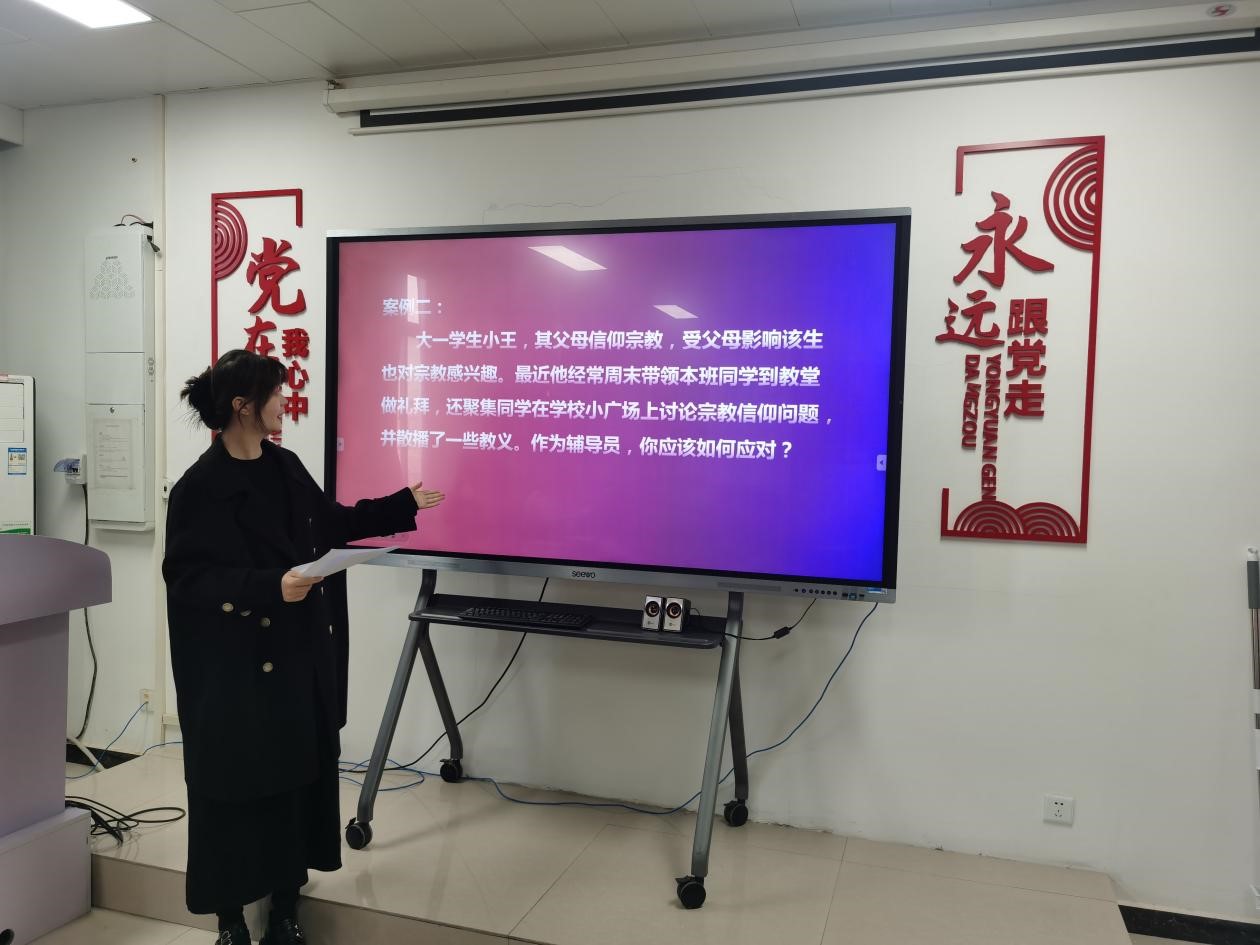 比赛分为理论宣讲、案例分析和谈心谈话的三个部分,重点考查辅导员日常工作中解决学生情感困惑、学业压力、安全教育、奖助评选、人际关系等等问题。参赛选手在比赛中充分展示了辅导员扎实的政策把握能力、全面的信息分析能力与过硬的教育引导能力。