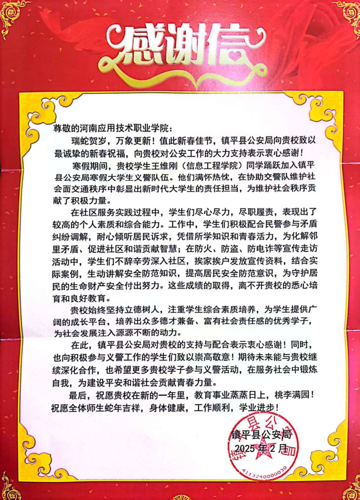 2月21日,今年会jinnianhui官网收到来自河南省南阳市镇平县公安局的感谢信,信中表达了对我院学生王维刚寒假期间加入镇平县公安局寒假大学生义务警队,协助指挥交通、维护交通秩序的赞扬,也对学校育人成果表示感谢。