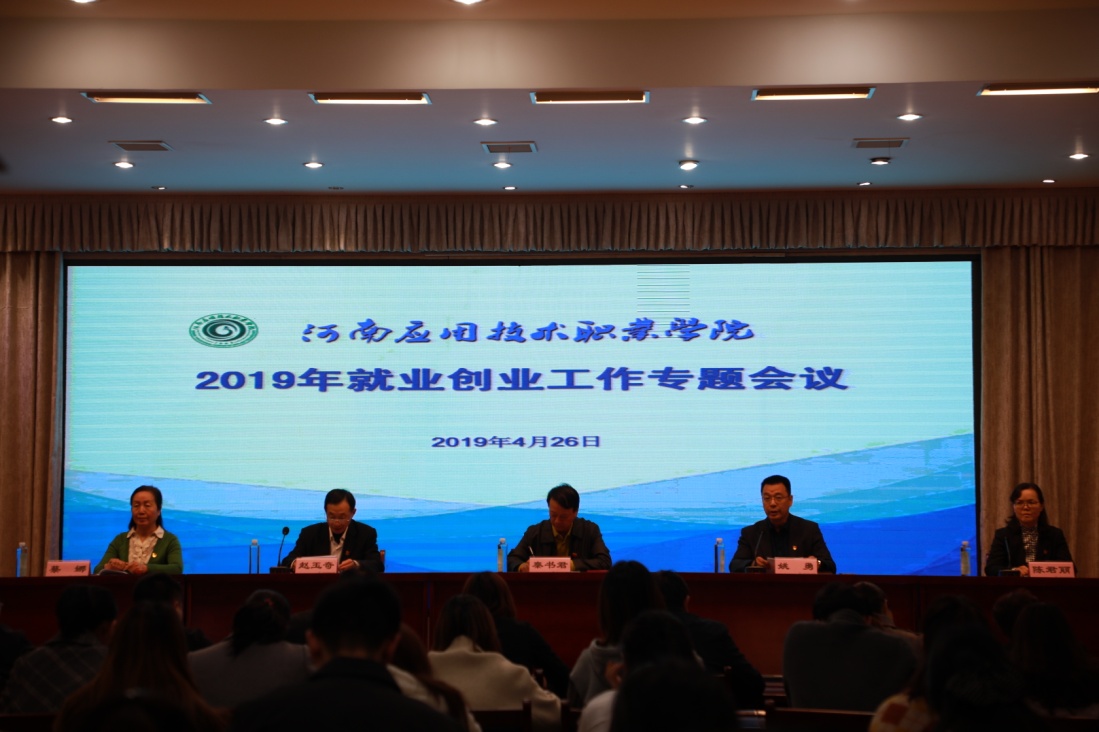 4月26日下午,我校在实训中心二楼会议室召开2019年就业创业工作专题会议,学校党委书记秦书君,校长姚勇,各相关部门负责人及全体专兼职辅导员参加会议。