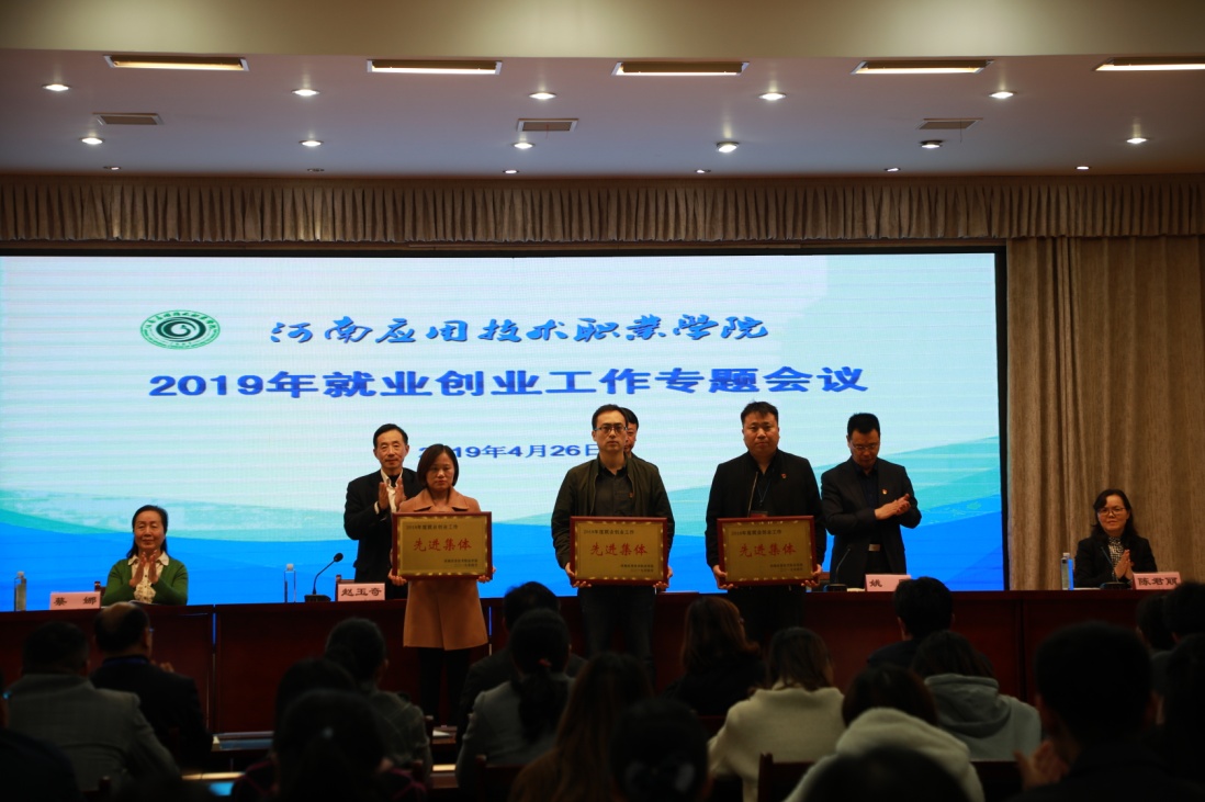 副校长赵玉奇宣读了《关于表彰2018年就业创业工作先进集体、先进个人的决定》,2018年我校共表彰先进集体3个,先进个人8人,校领导为受表彰集体及个人进行了颁奖。今年会jinnianhui官网、经济管理学院、商学院分别进行了交流发言。
